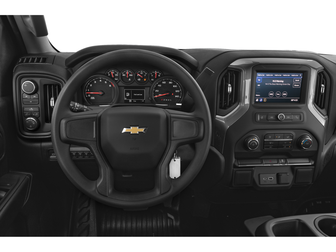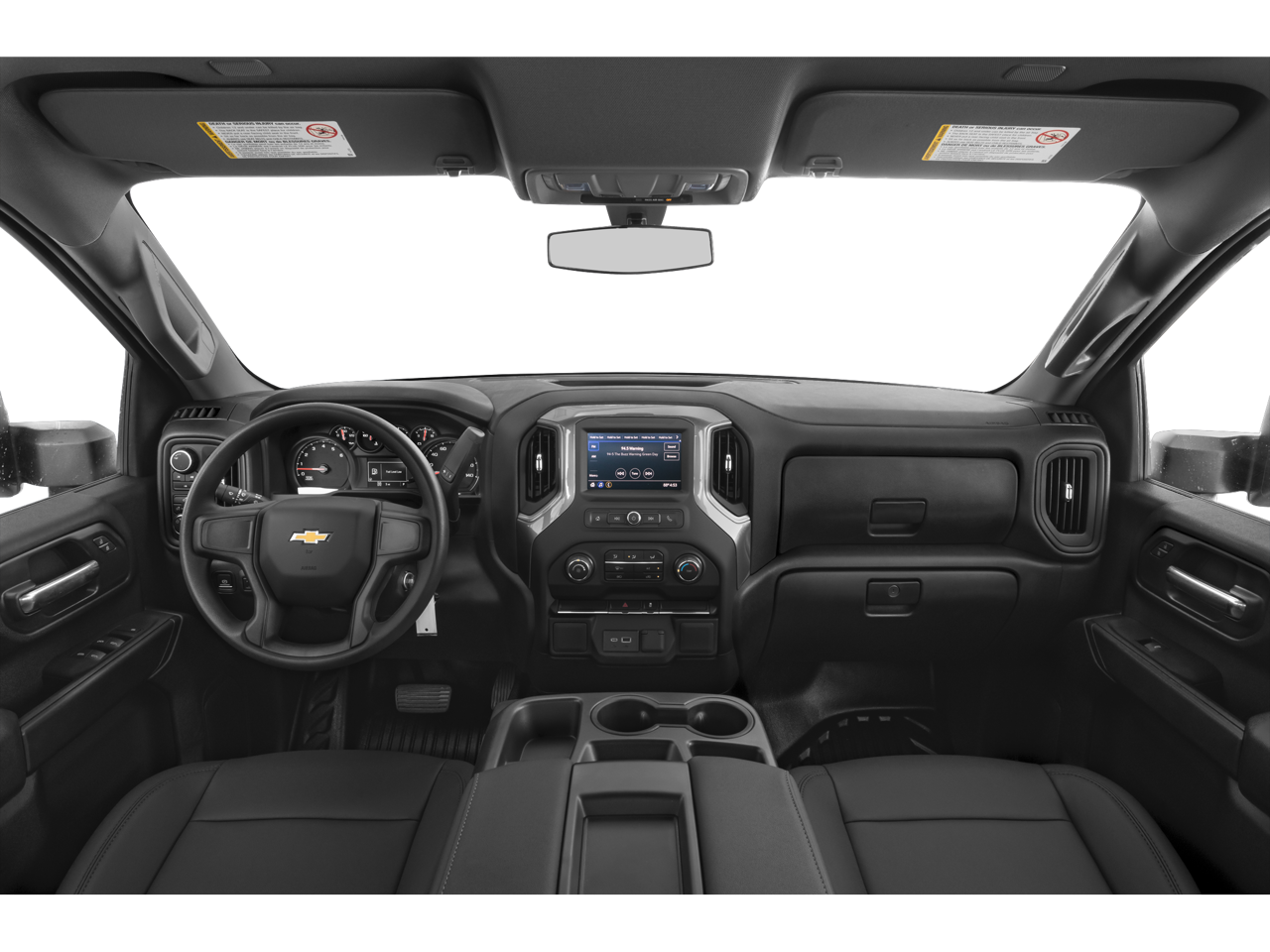 WT CONVENIENCE PACKAGE includes (AQQ) Remote Keyless Entry, (QT5) EZ Lift power lock and release tailgate, (AKO) tinted windows, (C49) rear-window defogger, (K34) cruise control, (DBG) power trailer mirrors with heated upper glass and manual extending/folding; MIRRORS, OUTSIDE POWER-ADJUSTABLE VERTICAL TRAILERING WITH HEATED AND AUTO-DIMMING UPPER GLASS lower convex mirrors, turn signal indicators, puddle lamps, perimeter lighting, auxiliary lighting, manual folding/manual extending (extends 3.31" [84.25mm]) Includes (DD8) auto-dimming rearview mirror. AUDIO SYSTEM, CHEVROLET INFOTAINMENT 3 SYSTEM 7" diagonal color touchscreen, AM/FM stereo. Additional features for compatible phones include: Bluetooth® audio streaming for 2 active devices, voice command pass-through to phone, wired Apple CarPlay® and Android Auto® capable. (STD), ENGINE, 6.6L V8 with Direct Injection and Variable Valve Timing, gasoline, (401 hp [299 kW] @ 5200 rpm, 464 lb-ft of torque [629 N-m] @ 4000 rpm) (STD), HEAVY-DUTY (STD). Chevrolet Work Truck with SUMMIT WHITE exterior and JET BLACK interior features a 8 Cylinder Engine with 401 HP at 5200 RPM*.